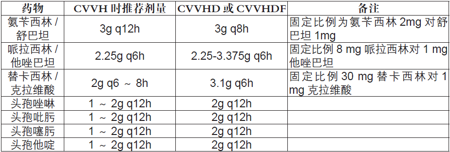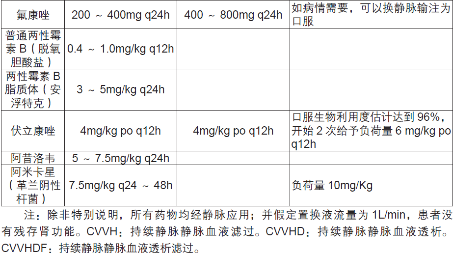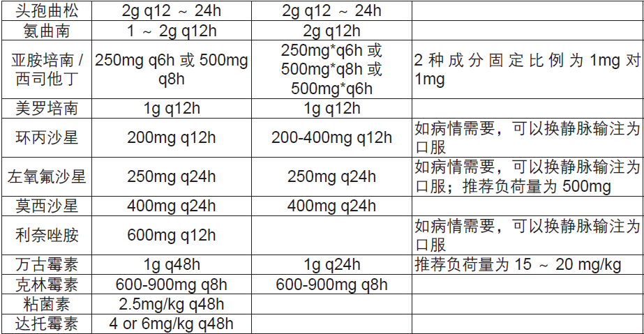 正在接受CRRT支持治疗的危重症患者的药代动力学非常复杂,很多参数会影响抗菌药物的清除,主要包括药物理化性质因素、患者因素和机械因素。药物因素主要包括:①药物的蛋白结合率,蛋白结合率越高,药物越容易与血清蛋白结合,越不容易透过CRRT清除,而蛋白结合率越低,游离药物浓度越高,越容易清除;②药物的分布容积,分布容积越大,药物与组织结合能力越大,越难以被清除。患者因素主要和药物的理化性质相关,如低蛋白血症时,血清蛋白水平下降,药物结合能力下降,可能出现游离药物比例增加,药物容易经CRRT清除;感染中毒症(Sepsis)时,药物通透性增加,客观上增加了药物的组织结合能力、增加了药物分布容积,药物不容易清除。机械因素包括:①CRRT时血液和置换液流量,流量越大,滤器跨膜压越大,药物清除效率越高;②滤器膜孔径的大小,孔径越大,药物清除效率越高,与传统滤器相比,现在生物合成膜滤器的孔径更大,能够更快地清除、更大分子量的药物。综合考虑上述因素,结合文献,现将常规CRRT条件下(CVVH),常用抗菌药物的剂量调整建议列表如下,供参考。需要指出的是,CRRT是抗菌药物的药代动力学非常复杂,影响因素众多,条件允许,监测血药浓度将更有利于药物的规范、有效的应用。